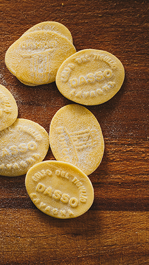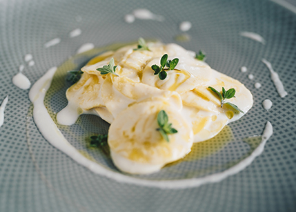 Un esempio di primo piatto sono i corsetti tigullini – pasta fresca di semola di grano duro, tuorlo, vino bianco e sale fine – conditi con “pesto bianco” a base di aglio di Vessalico, pinoli di San Rossore, Parmigiano 30 mesi, Fiore Sardo, olio di Lavagnina e maggiorana a crudo.
